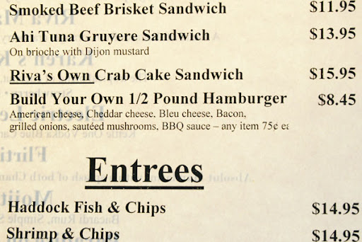 I worked at Navy Pier after graduating college when money was tight. Aside from American Dog which is the best value for food on the Pier, Riva's was known for having the best quality food for a decent price. The Riva burger is the best buy for the money. Down the Pier the Dock Street Cafe offers a 1/3 lb burger with 2 toppings for $9.99. The Riva is adds up to $9.95 for a 1/2 lb with 2 toppings. While I agree that cheese is not a topping to be paid for, $.75 for bacon is a steal.